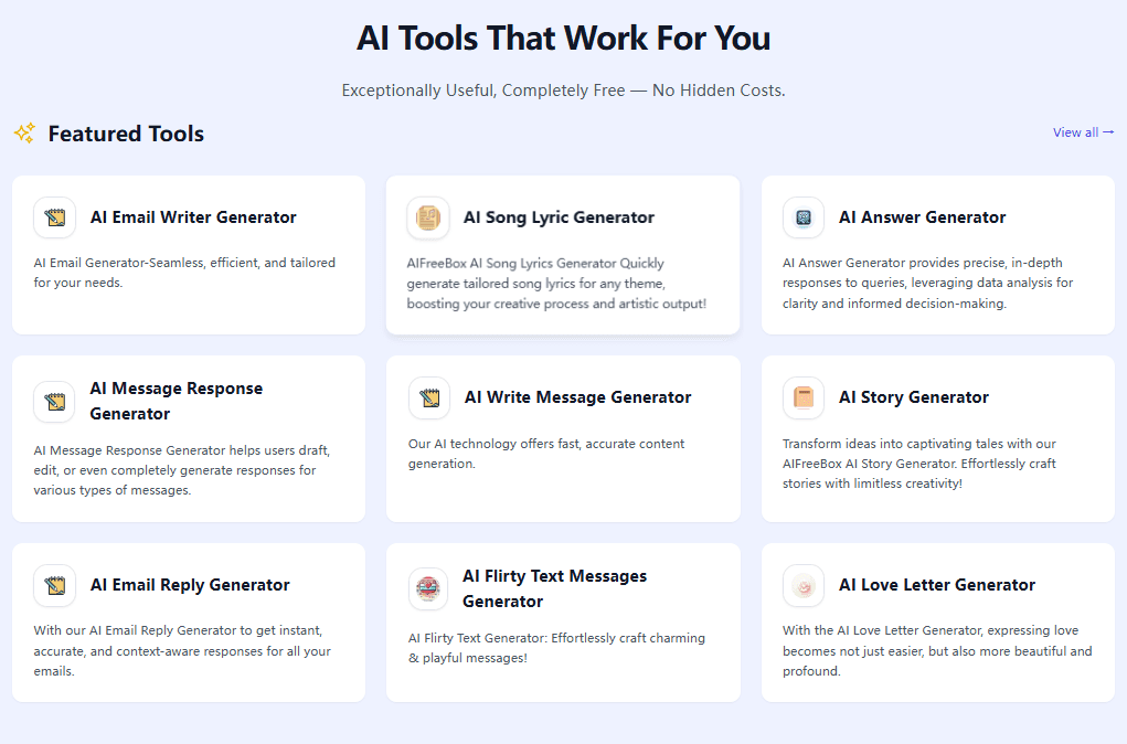 Ai Free Box is an innovative AI-powered platform that offers a suite of tools aimed at improving productivity and creativity. Whether you're looking to generate responses, craft emails, or even compose song lyrics, Ai Free Box has got you covered. The platform leverages advanced AI technologies to provide users with a seamless and efficient experience.