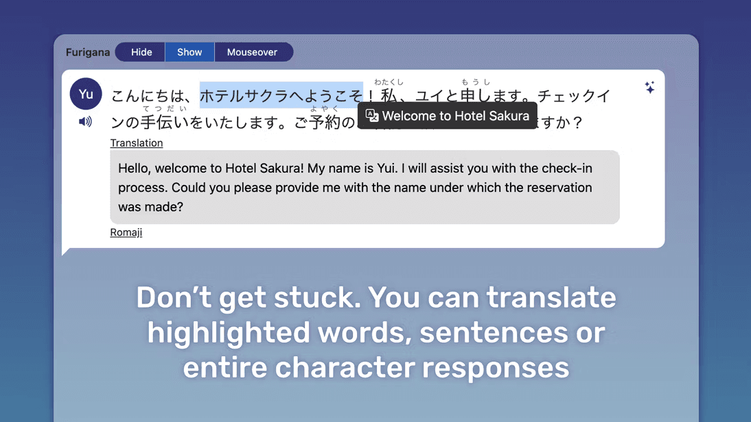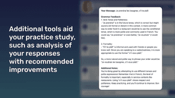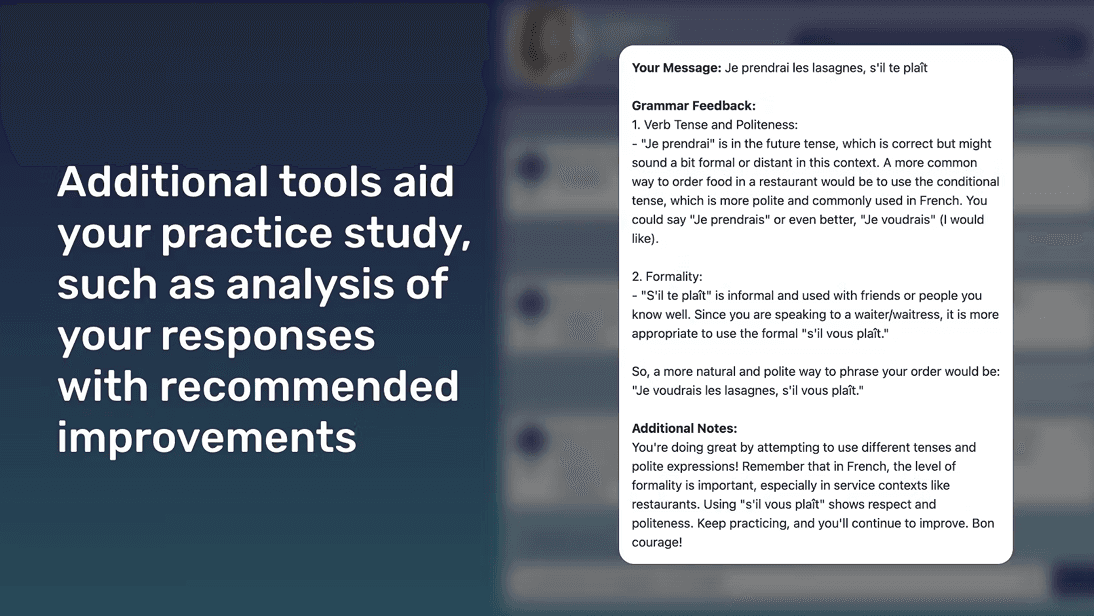 The app is intended for language learners, and as such, I have added features to enhance your language practice, such as analysing your responses and providing feedback, breaking down the grammar of the AI character’s messages, Slowing down audio playback and suggesting your next response to keep the conversation flowing.