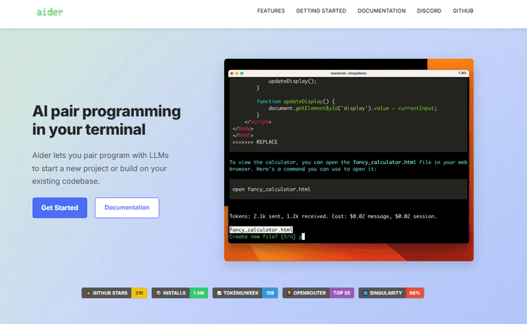 Aider is an AI-powered pair programming tool that integrates with your terminal and preferred IDEs, enabling seamless collaboration with large language models (LLMs) to enhance your coding workflow. With over 1.9 million installs and 31,000 GitHub stars, Aider has garnered significant attention in the developer community.