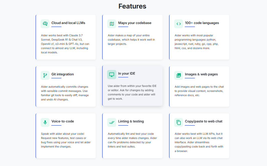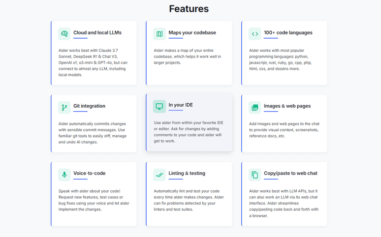 Aider is designed to assist developers by providing AI-driven code suggestions, refactoring, and documentation generation directly within their development environment. It supports a wide range of programming languages, including Python, JavaScript, Rust, Ruby, Go, C++, PHP, HTML, CSS, and more.