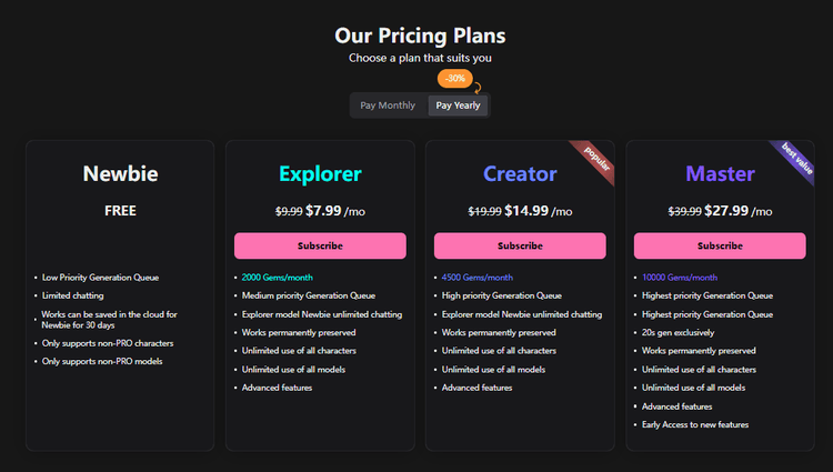 Ainime offers a tiered pricing structure that caters to different user needs and budgets. The platform starts with a generous free tier that allows users to get a feel for the basic functionality. This includes limited image generations and character interactions per day - enough to test the waters before committing financially.