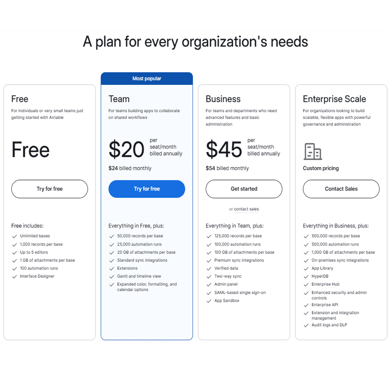 Airtable offers a tiered pricing structure to cater to various business needs: