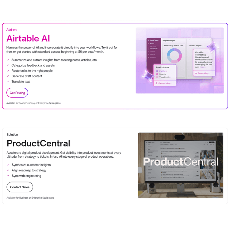 For AI functionalities, Airtable operates on a credit-based system. During the preview phase, organizations receive 500 monthly AI credits per seat for free. Standard access begins at $6 per seat/month, providing 3,500 monthly AI credits per seat. Additional credits can be purchased as needed.