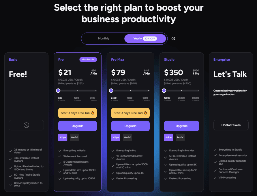 Akool offers a range of pricing plans designed to cater to different needs and budgets. Whether you're an individual content creator or a large enterprise, there's a plan that suits your requirements.
