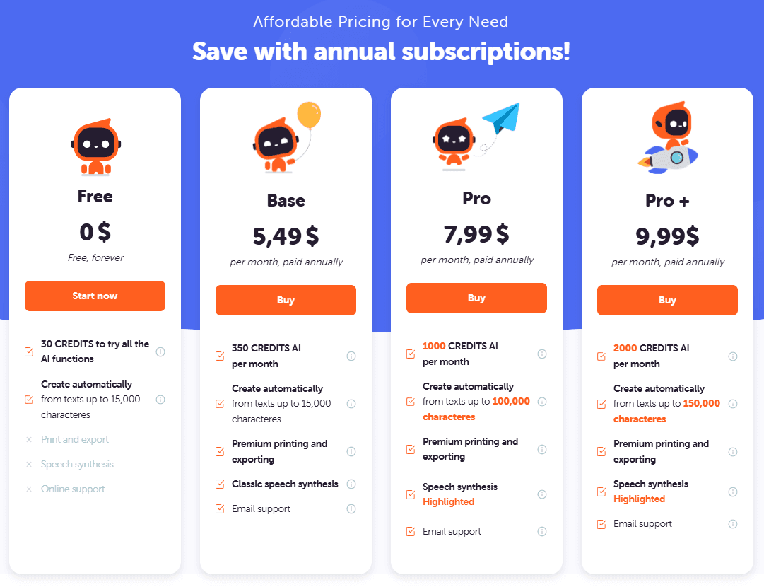 - Base Plan: Priced at $5.49/mo(annually plan) or $6.99/mo(month plan), the Base Plan offers 350 credits monthly. Users can generate automatic maps from texts up to 15,000 characters, access premium print and export features, utilize classic speech synthesis, and receive email support.