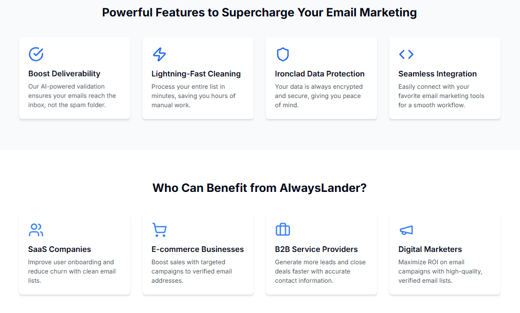 The platform uses advanced AI technology to craft personalized, engaging emails that not only bypass spam filters but also generate meaningful responses from your prospects. Whether you’re looking to boost the performance of your cold email marketing campaigns or enhance your AI lead generation capabilities, AlwaysLander offers a comprehensive solution that covers the entire email marketing funnel.
