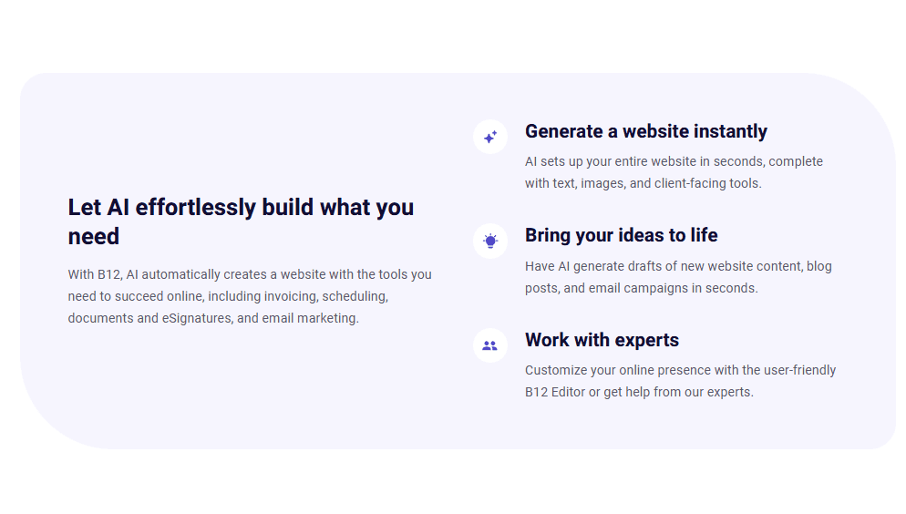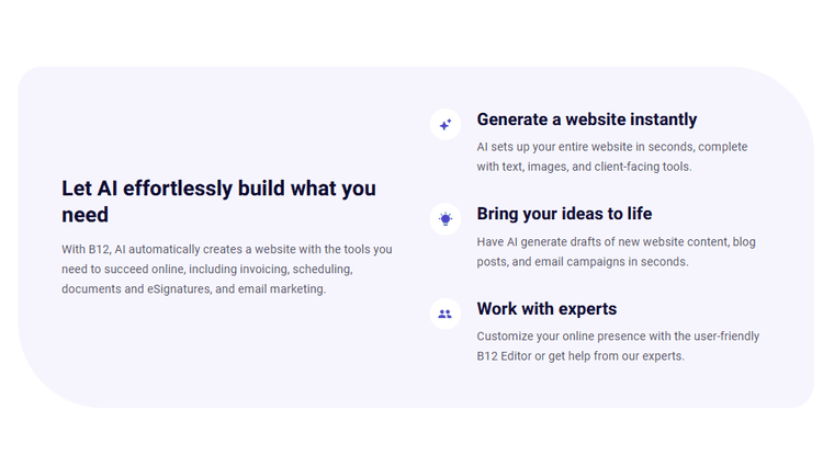 - Squarespace/Wix: Requires manual design vs B12's AI-automated process