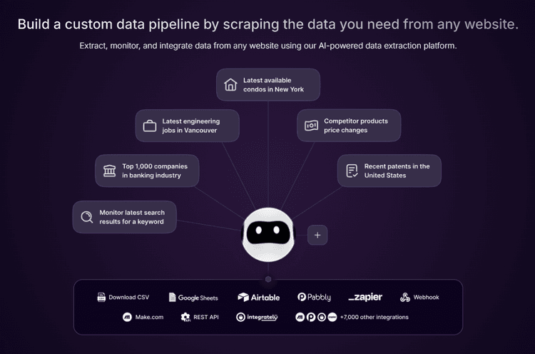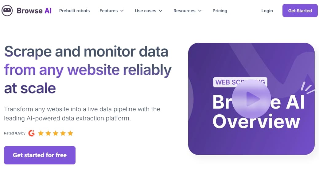 Unlike traditional scrapers requiring coding skills, Browse AI offers a no-code solution. Just point-and-click to train its AI to extract specific elements from any webpage. The platform supports scheduled monitoring, delivering fresh data directly to your Google Sheets or via API.