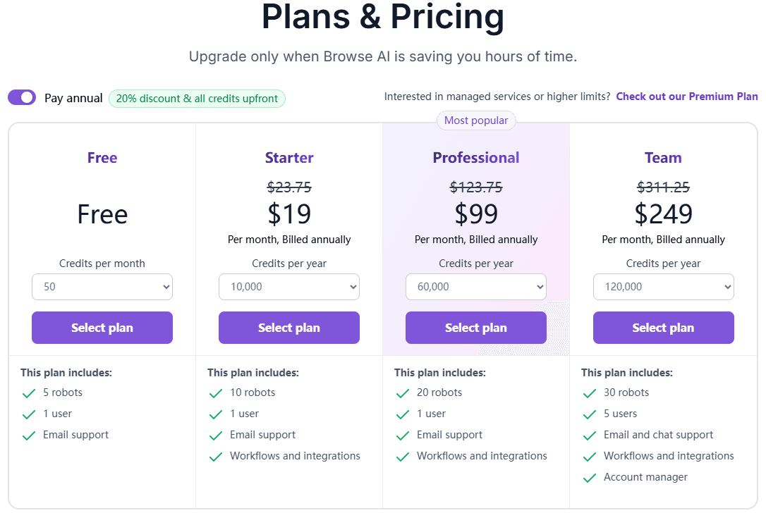 Now that we know what Browse AI does, let’s talk about pricing. How much does this AI web crawler actually cost? The good news is that Browse AI offers flexible pricing plans to suit different needs and budgets.