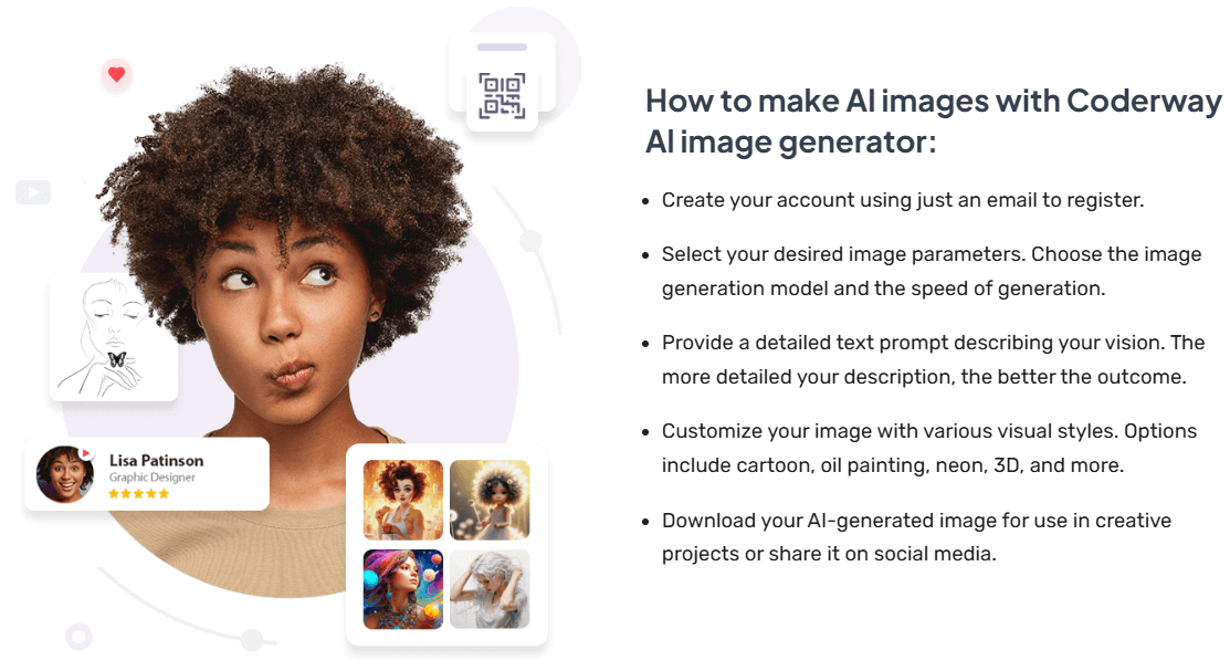 Coderway AI's user interface is intuitive and easy to use, which is worth mentioning. Even if you are new to AI image generation, you can easily get started. The text prompt box is prominently placed, and the platform also provides practical suggestions to help you design effective prompts.