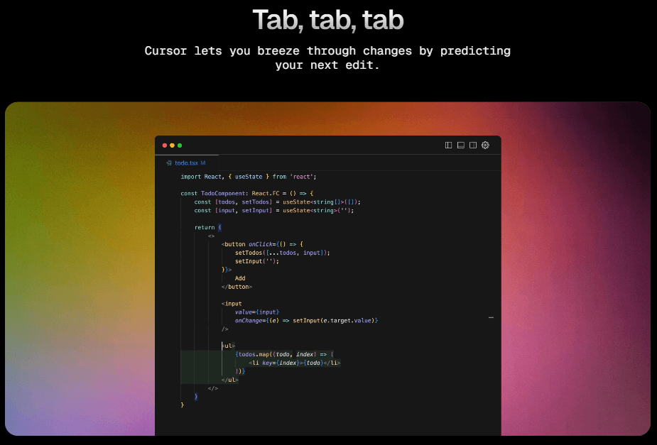 - AI Code Completion: Cursor AI uses advanced algorithms to predict and complete your code, saving you time and reducing errors.