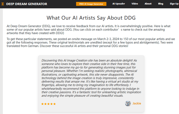 User feedback for Deep Dream Generator has been overwhelmingly positive, with many users praising the platform's ease of use, customization options, and the quality of the generated images. One user commented, "Deep Dream Generator has completely transformed the way I approach digital art. The ability to create such unique and visually stunning images with just a few clicks is incredible." Another user noted, "I love the level of control I have over the image generation process. It's like having a digital artist at my fingertips."