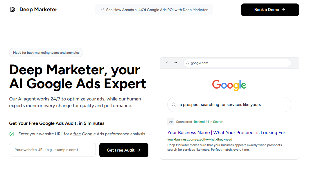 Deep Marketer is a specialized AI-powered advertising assistant designed to revolutionize how marketers create, optimize, and manage their Google Ads campaigns. Unlike generic marketing tools, Deep Marketer focuses specifically on transforming ad performance through intelligent automation and data-driven insights.