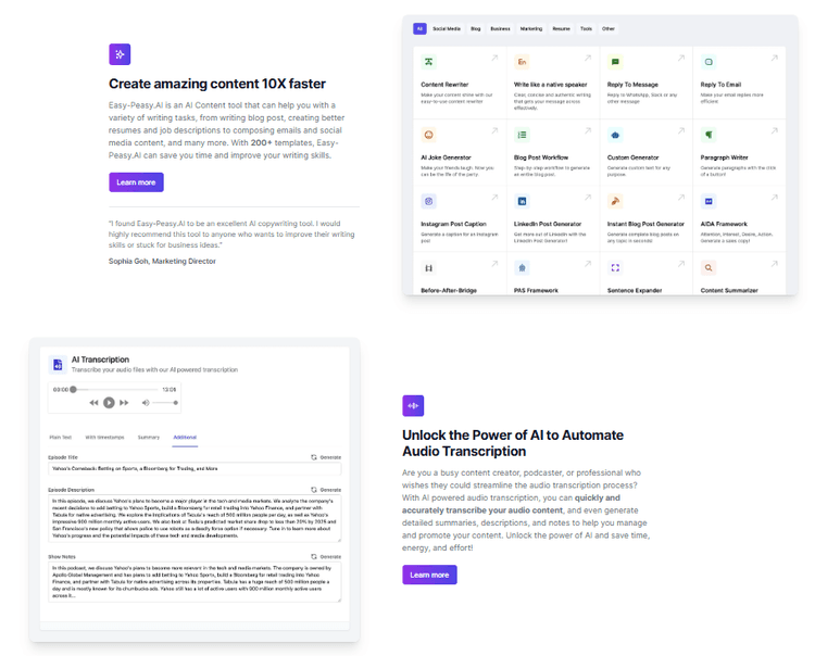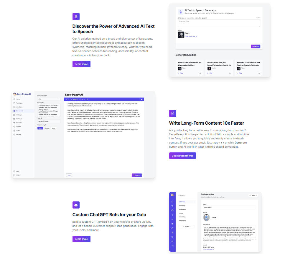 One of the standout features of Easy Peasy AI is its versatility. Whether you need to generate high-quality content, analyze large datasets, or automate repetitive tasks, Easy Peasy AI has got you covered. The platform supports multiple languages and integrates seamlessly with various third-party applications, enhancing its utility across different industries.
