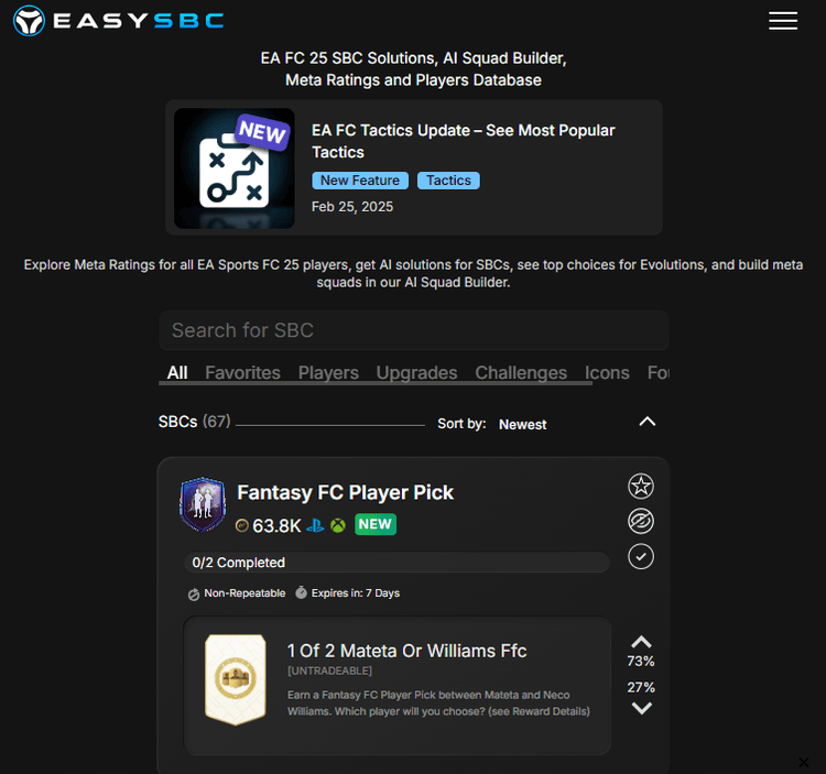 EasySBC is an innovative AI-powered platform designed to revolutionize the way players approach Squad Building Challenges (SBCs) in EA Sports FC 25.