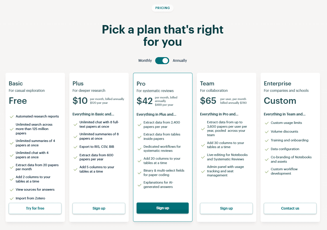 When it comes to pricing, Elicit offers a range of plans to suit different needs and budgets. Whether you're an individual researcher or part of a large institution, there's a plan that's right for you.