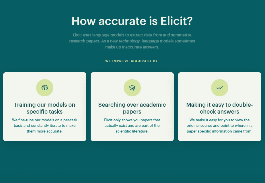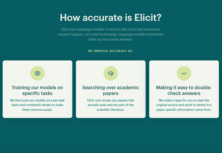A:Elicit is highly accurate, thanks to its advanced AI algorithms. However, like any tool, it's always a good idea to double-check the information it provides.