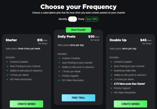 Faceless.video offers a range of pricing plans to cater to different user needs and budgets. While it's always best to check the official website for the most up-to-date pricing information, here's an overview of the typical plan structure: