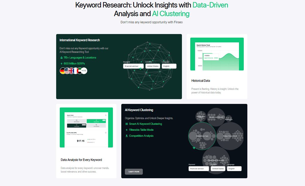 2. SEO smart engine: In addition to basic keyword optimization, Finseo analyzes competitor content, identifies topic gaps, and recommends content structures that have been successful in the financial services sector.