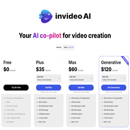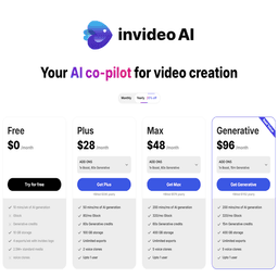 Invideo AI offers three main subscription plans: Plus, Max, and Generative. The Basic plan is ideal for individuals and small businesses, offering essential features at an affordable price. The Business plan is tailored for larger organizations, providing advanced features and higher usage limits. The Unlimited plan, as the name suggests, offers unrestricted access to all features, making it suitable for heavy users.