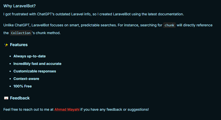 LaravelBot is powered by advanced language models similar to those behind ChatGPT, but with a crucial difference: it's been specially trained on Laravel-specific data. This specialized training allows LaravelBot to understand and respond to queries about Laravel's ecosystem with remarkable accuracy.