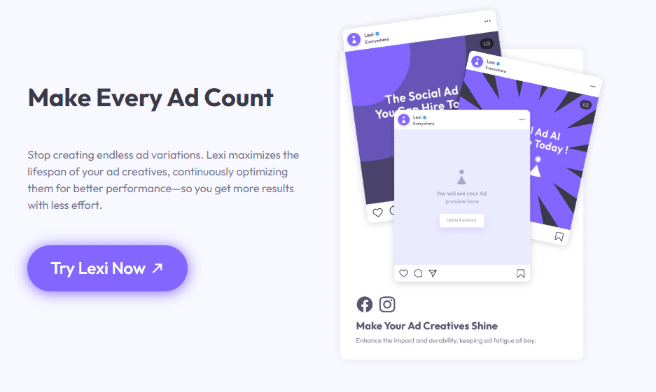 2. Platform-specific optimization: Whether you’re creating ads for Facebook, Instagram, Google, TikTok, or LinkedIn, Lexi AI automatically adjusts content based on each platform’s best practices and technical requirements.