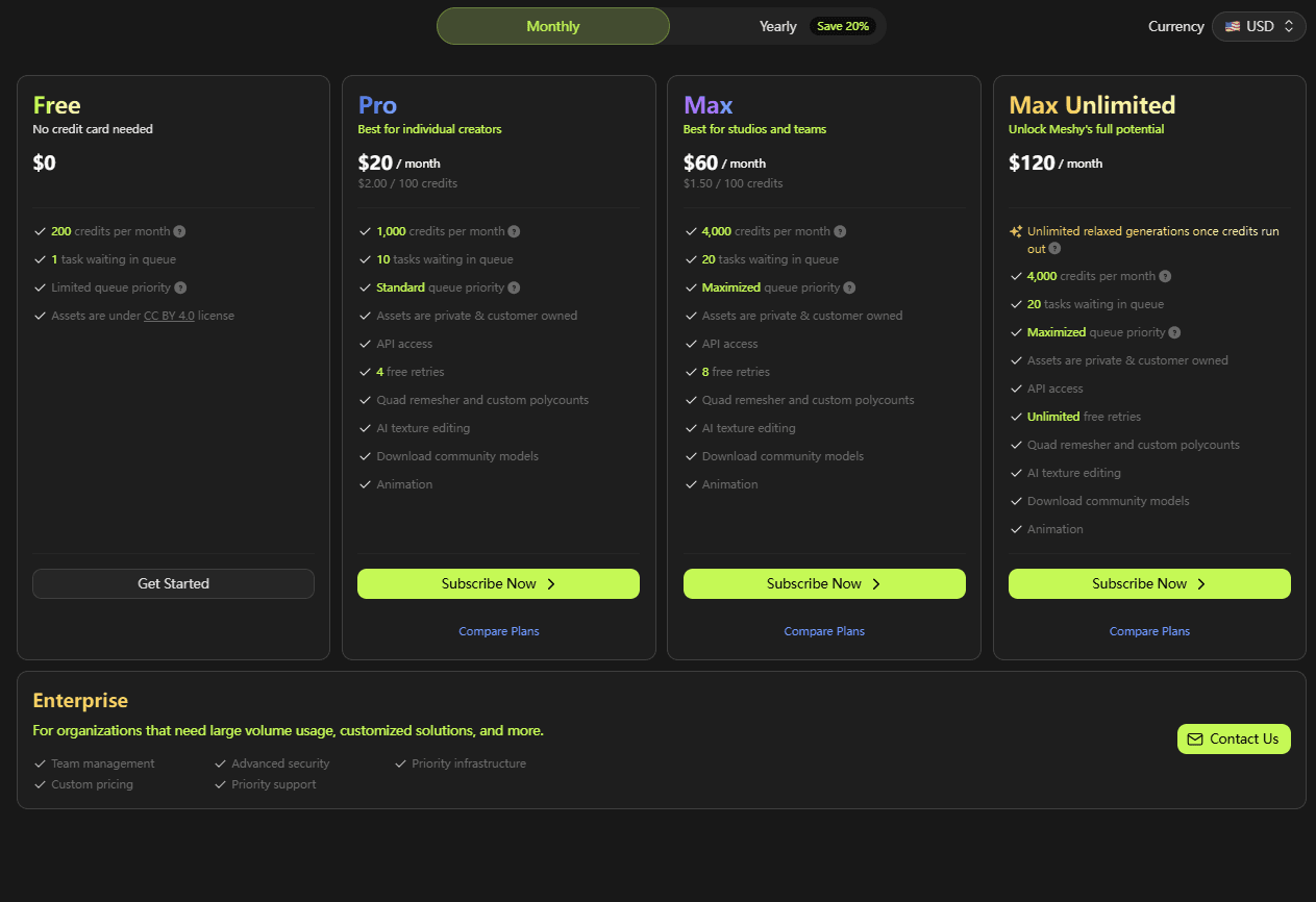 For detailed information on Meshy's pricing, you can visit their official pricing page.