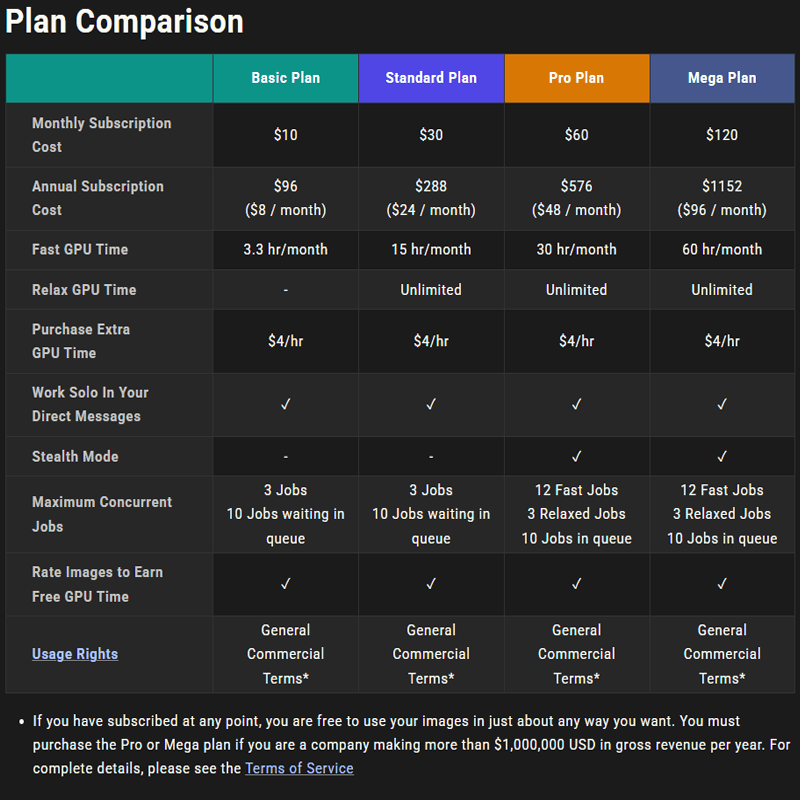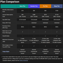 The Mega Plan $120/month for 60hr/month Fast GPU Time and Unlimited Relax GPU time. For when you’re ready to replace your day job with “AI Artist Extraordinaire.”