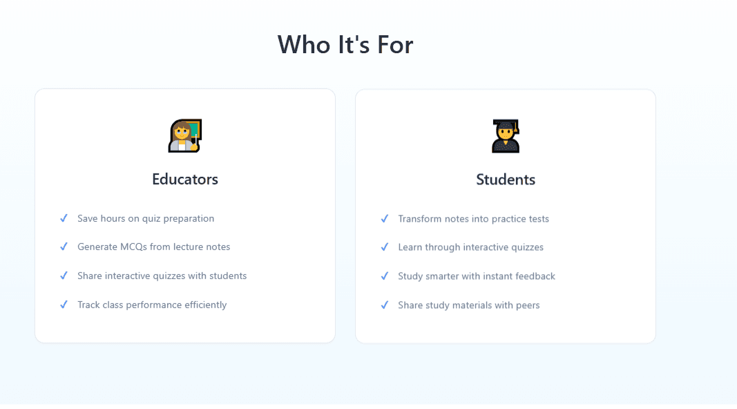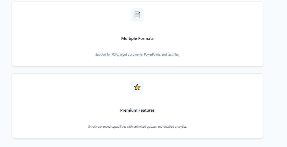 Looking ahead, Qwizzard continues to enhance its AI Question Generator capabilities. According to their development roadmap, upcoming features include adaptive questioning (where quiz difficulty adjusts based on user performance), enhanced multimedia support for video-based quizzes, and expanded analytics to provide deeper insights into student performance patterns.