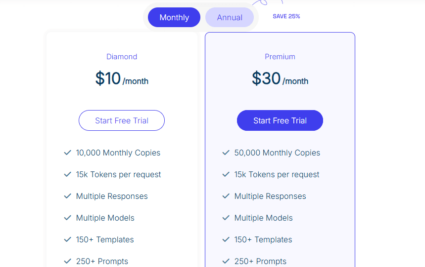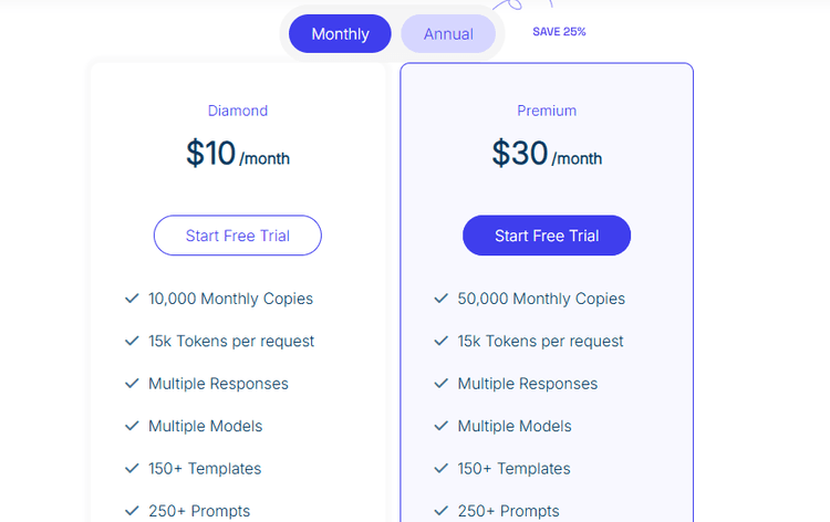 It's worth noting that annual subscriptions come with approximately 25% savings compared to monthly billing, making it an attractive option if you're planning long-term usage of this AI copywriting assistant.
