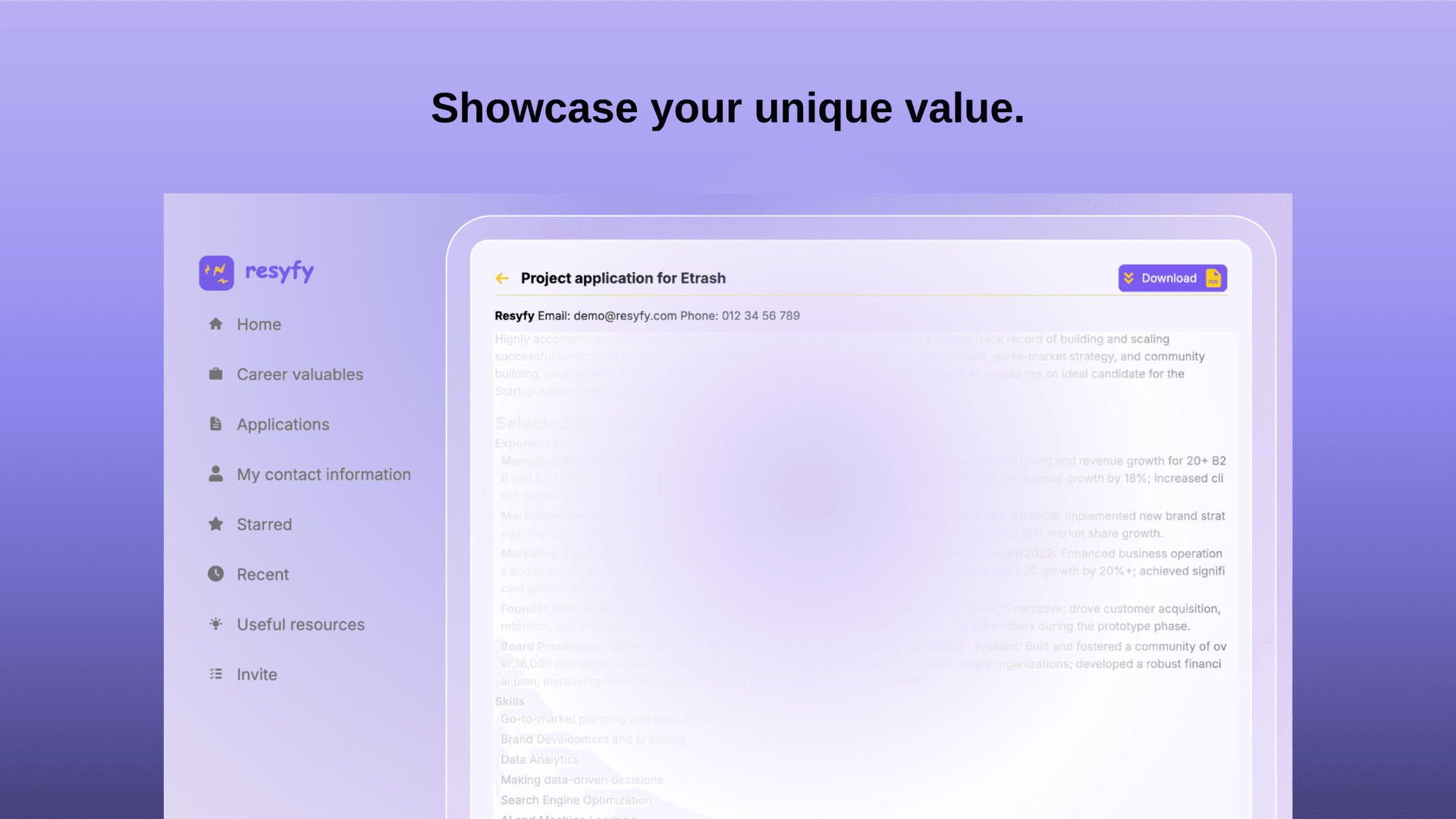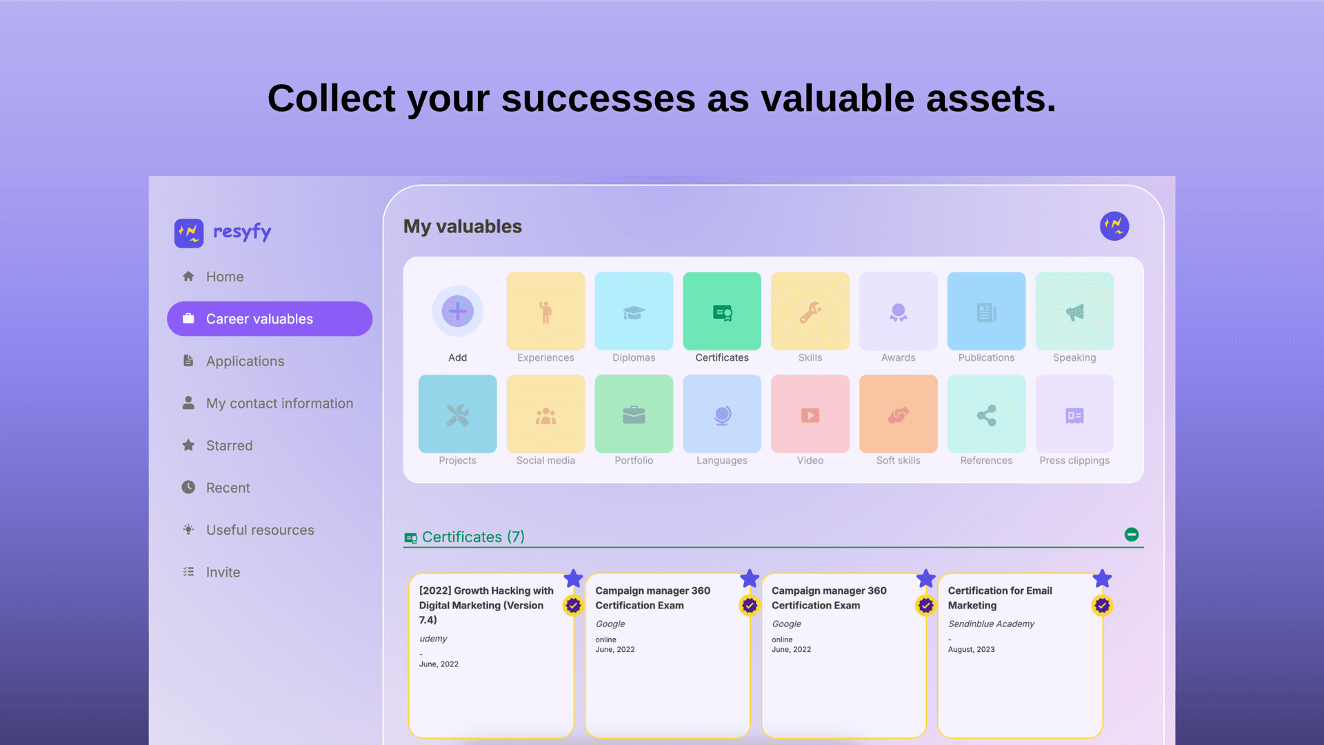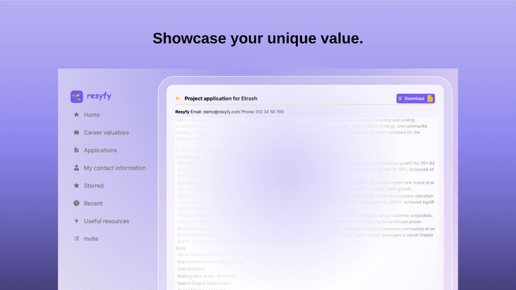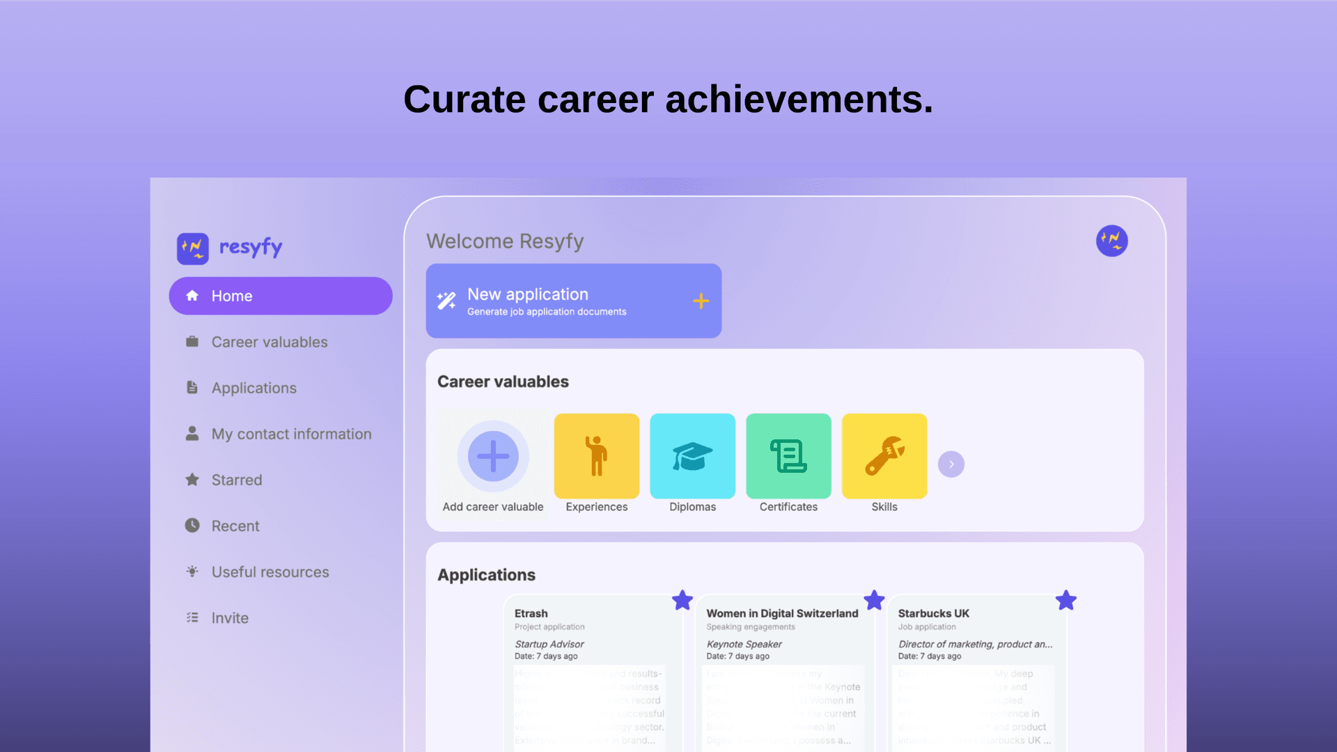 Everything stays safe in your digital vault, and you control what you share and when. It's simple, secure, and seriously helpful for staying ahead in a world where careers move fast. Resyfy is all about making your next big move as easy—and impactful—as possible.