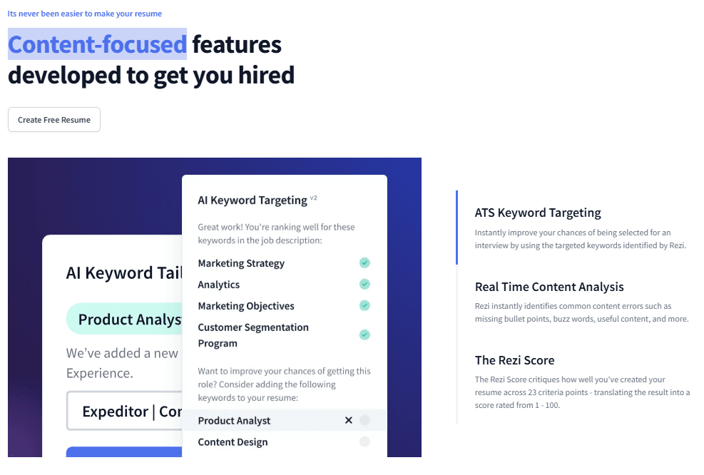 Rezi AI also utilizes data analytics to offer personalized recommendations. For instance, if you're applying for a marketing role, the platform might suggest emphasizing your digital marketing skills and experience. This level of customization ensures that your resume and cover letter are tailored to the specific job you're applying for, increasing your chances of landing an interview.