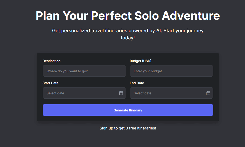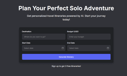 Solo Trip Planner is a cutting-edge AI trip planner specifically designed for solo travelers who want personalized itineraries without the hassle of extensive research. This platform leverages artificial intelligence to create customized travel plans based on your preferences, budget constraints, and desired experiences.
