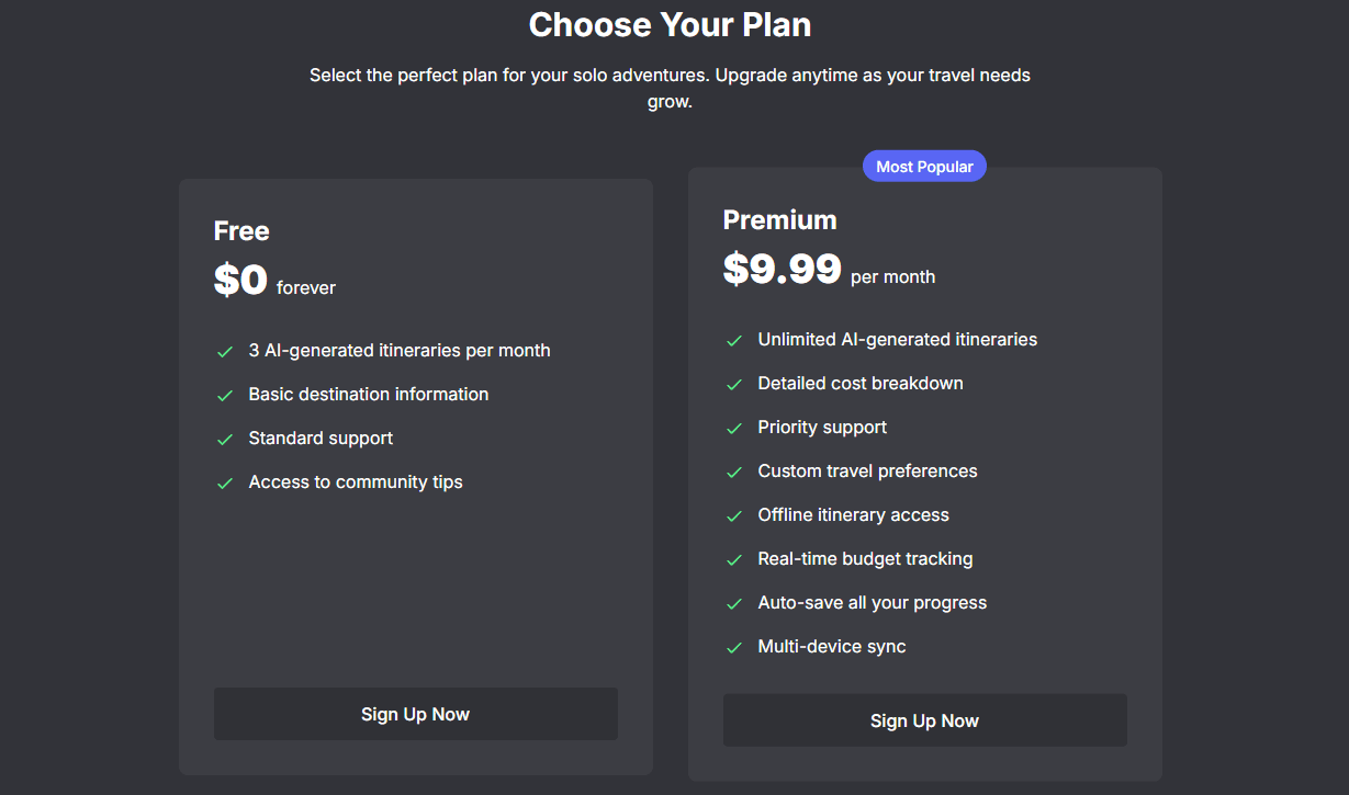 Pricing Plans for Solo Trip Planner