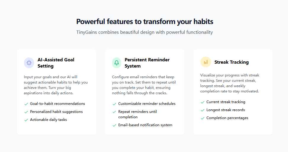 Unlike standard habit trackers, TinyGains uses AI to provide personalized motivation, adaptive goal setting, and interactive check-ins that continuously improve based on your habits. The focus of TinyGains is on making daily progress enjoyable, not just tracking progress.