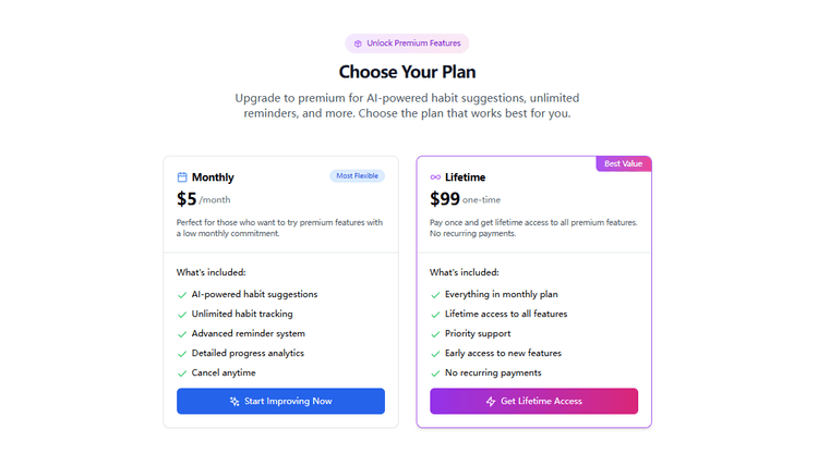 1. Personalized Accountability Partner: The AI serves as your daily check-in buddy, adapting its communication style and motivation techniques based on your response patterns and progress history. This creates a uniquely personal experience that evolves as it learns more about how you respond to different types of encouragement.