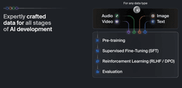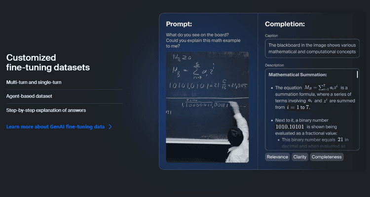 - Generative AI Services: Toloka offers model fine-tuning, reinforcement learning from human feedback (RLHF), and evaluation services. These are essential for refining AI models to perform specific tasks with high accuracy.