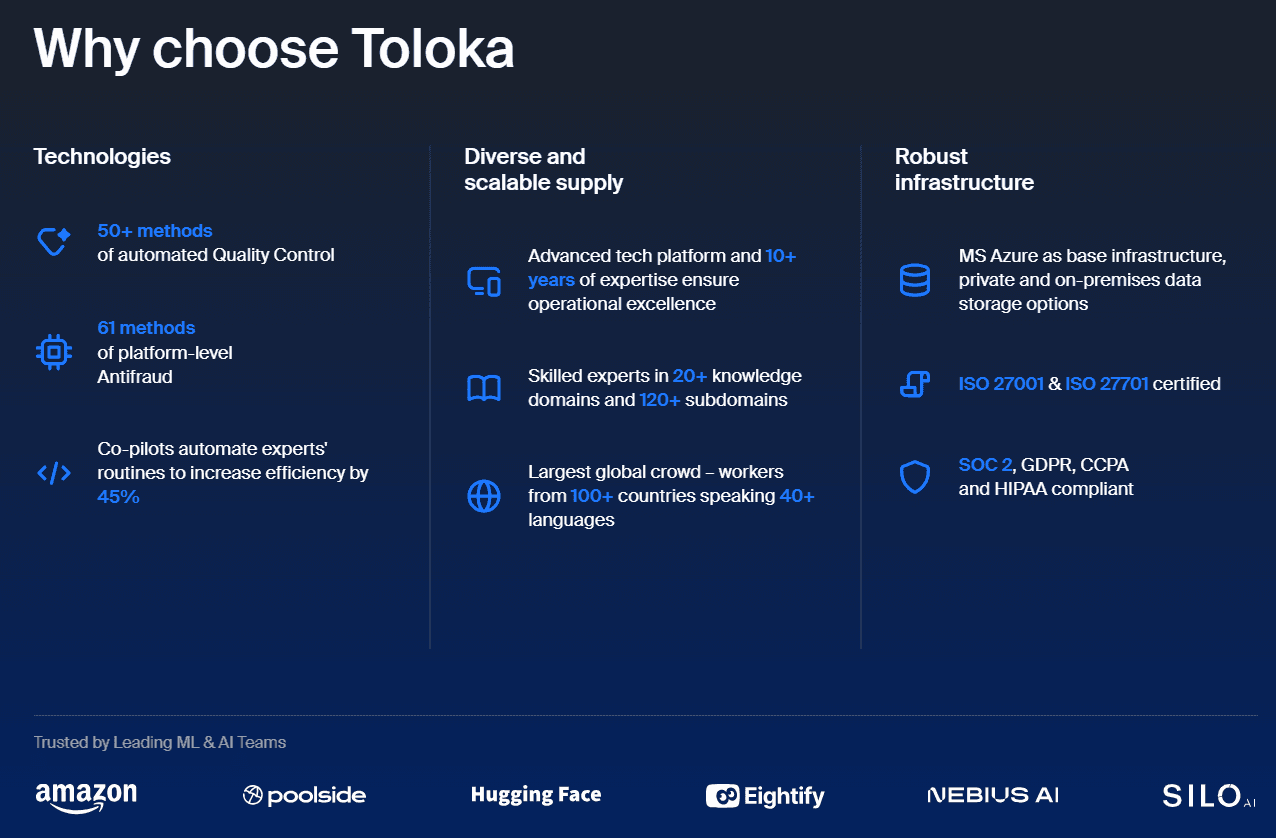 - Finance: Financial institutions utilize Toloka's data services for fraud detection, risk assessment, and customer service automation.