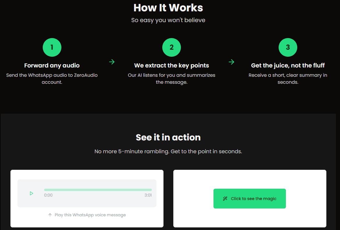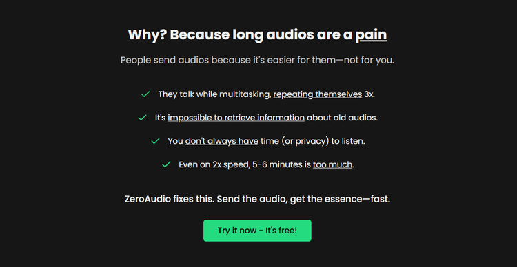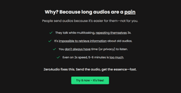 How does this pricing compare to the market? ZeroAudio positions itself competitively, offering more processing time per dollar than several major competitors. While not the cheapest option available, the quality-to-cost ratio makes it an excellent value proposition, especially considering the accuracy of its AI Long Audio Summary capabilities.