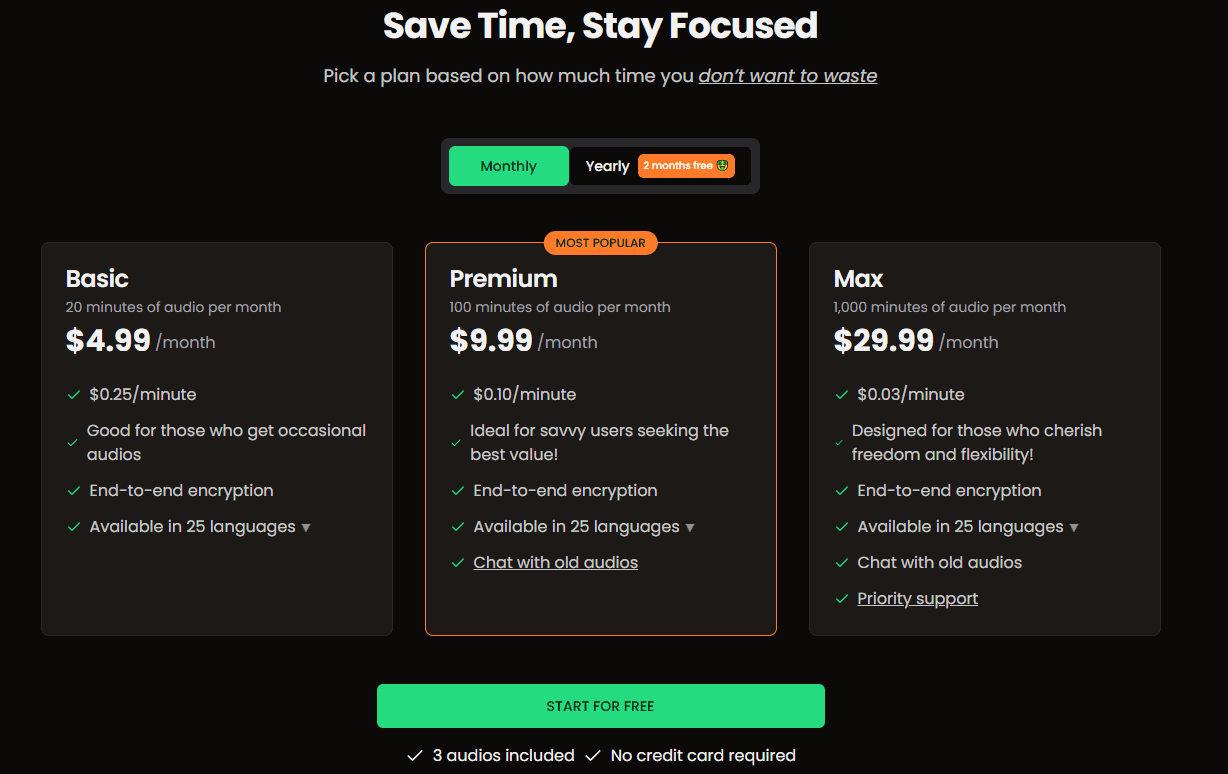 ZeroAudio offers a tiered pricing structure designed to accommodate various user needs, making this powerful AI Summarizer accessible to different budget levels.